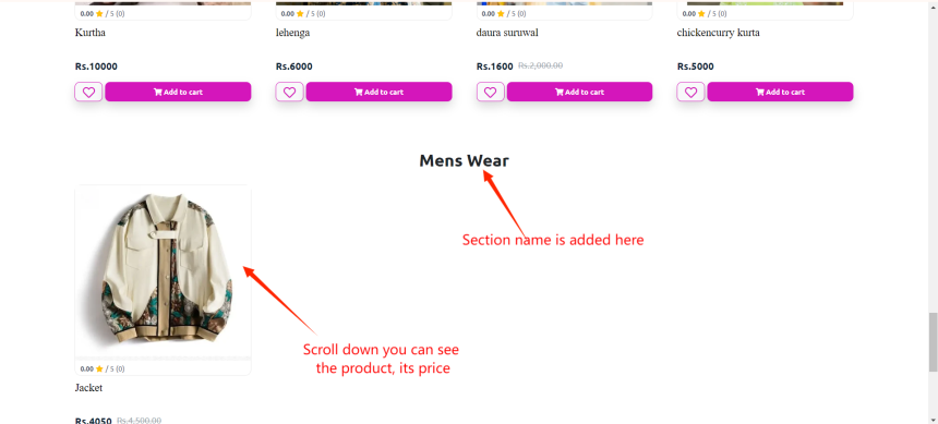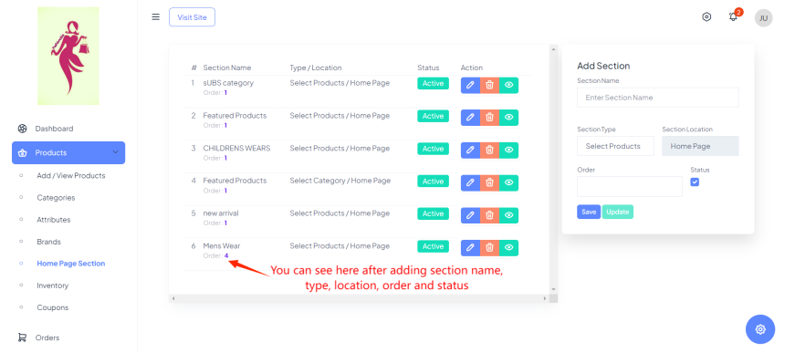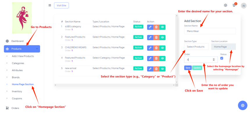 Step 1: Go to Products, click on homepage section. At the right side there you can see add section (section name, type, location and order) and click on save.