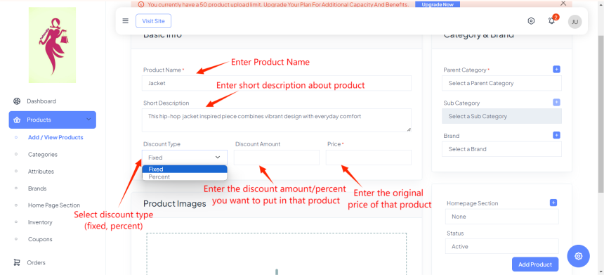 Step 4: Enter product name, short description, discount type(fixed, percent), discount amount/ percent and the original price of that product.