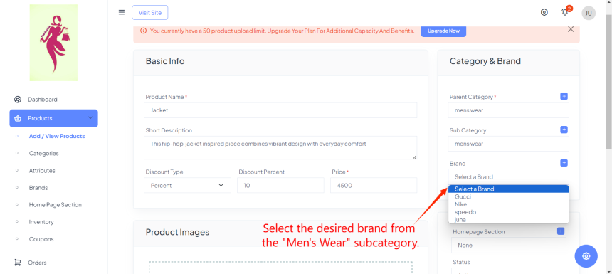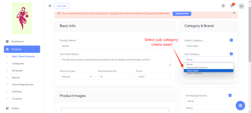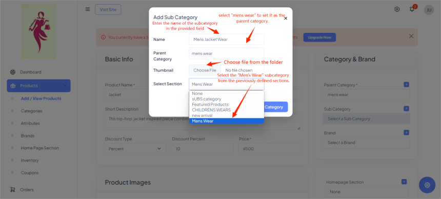 Step 7: Click on add sub category where you have to fill up the name, selecting parent category, choose the thumbnail, and at last select the sub category section (i.e Mens Wear). After adding it, select it.