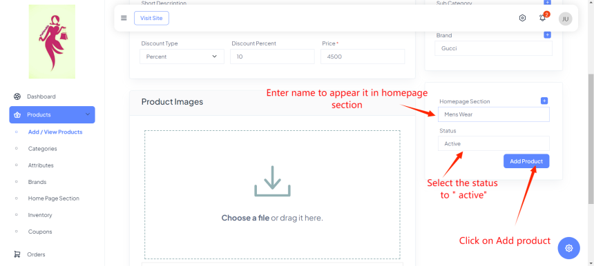 Step 9: Enter and add name to appear it in homepage section, select the status and click on add product.