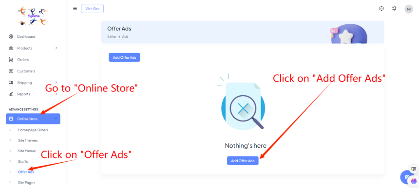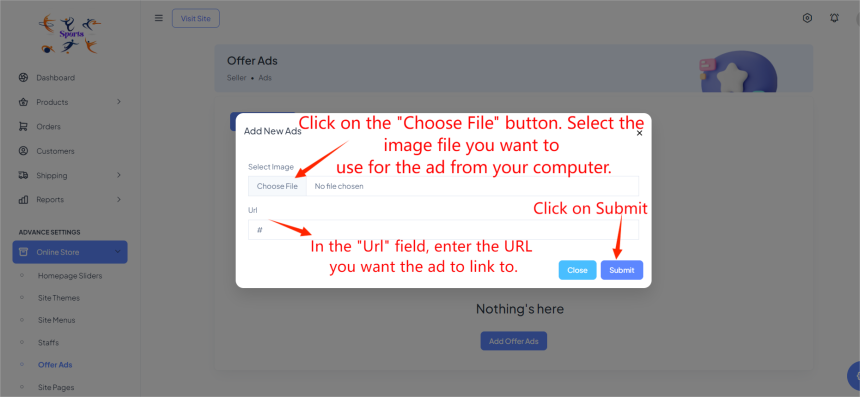 To add offer ads in Brodox, navigate to the "Online Store" section in your dashboard and select "Offer Ads". Click "Add Offer Ads", upload your desired image, enter the target URL, and click "Submit" to save and display the ad.