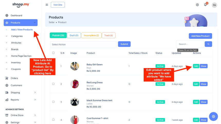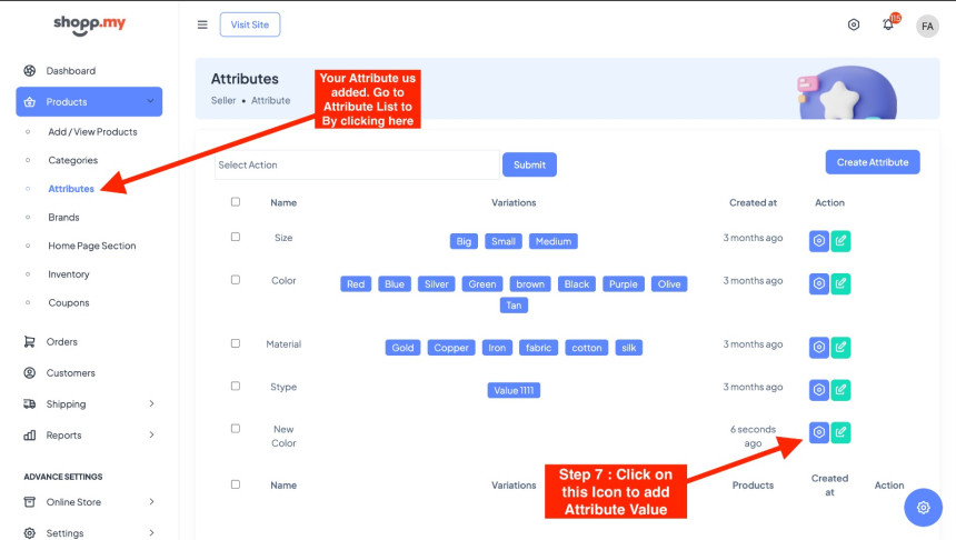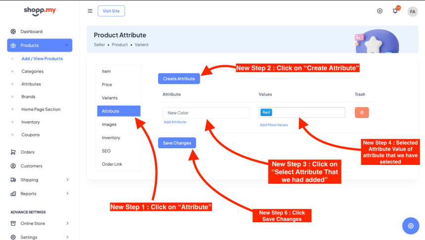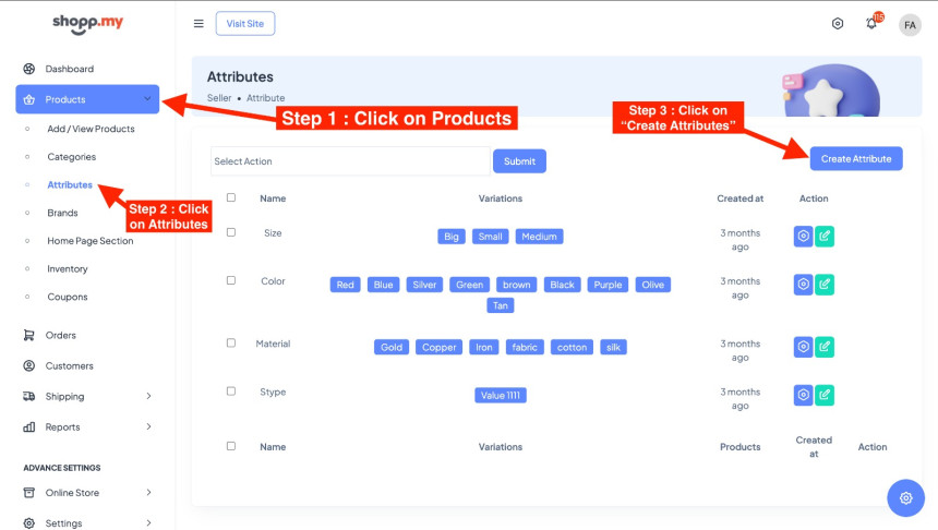 Step (1-3) : First, log in to your account. Navigate to the products section, click on attributes, and then select the option to create attributes.