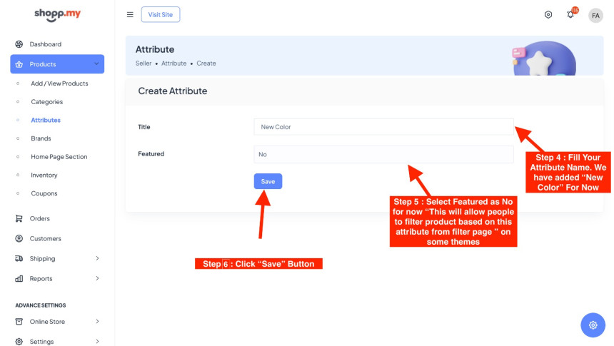 Step (4-6) : Enter the attribute name, such as "new color." Choose "No" for the featured setting to enable filtering by this attribute on certain themes. Finally, save your changes by clicking the Save button.