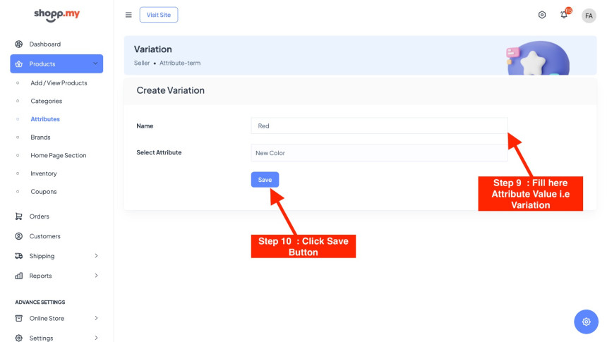 Step (9-10): Enter the attribute value, such as a variation or specific option. After filling in the attribute value, click on the "Save" button to store your changes.
