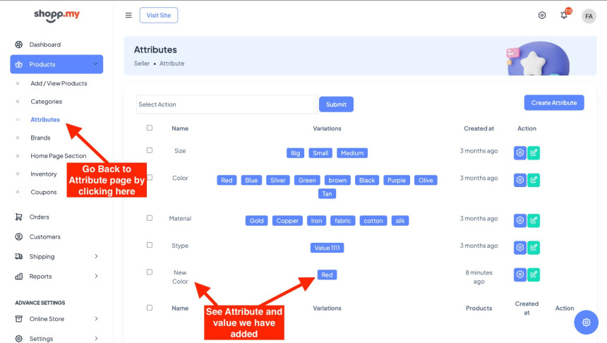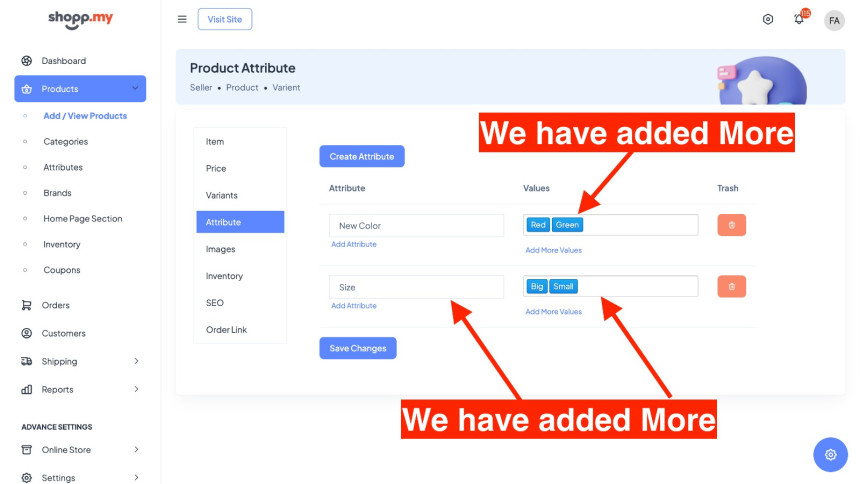 After completing the above steps, you'll notice that we have successfully added new attributes for color and size. You can continue adding additional attributes as needed. There is no limit to the number of attributes you can include, allowing you to customize and categorize your products extensively.