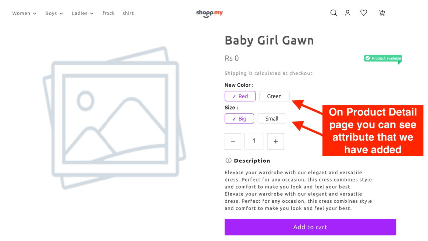 On the product detail page, you'll find the attributes we added displayed. These attributes, such as color and size, allow customers to select their preferred options directly from the product page.