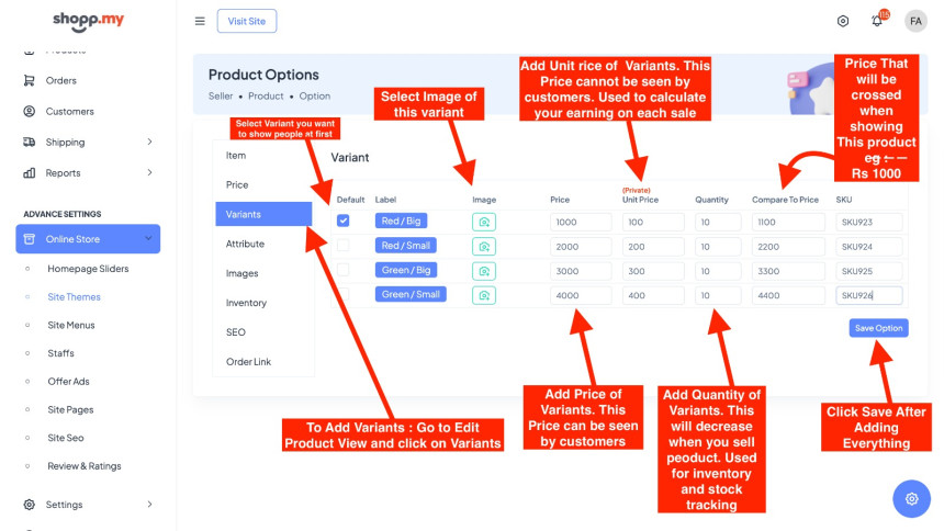 To add variants to your product, go to the product edit view, click on "Variants," choose which ones to show, add images, set customer prices, enter unit prices for your earnings calculation, specify quantities for inventory. Optionally, enter a crossed-out price to show the original price of the product. Finally, remember to save your changes after completing these steps.