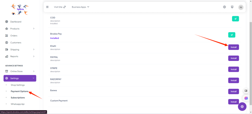 To integrate Khalti in Brodox, obtain your API credentials from Khalti, then log in to your Brodox admin panel, navigate to the payment settings, select Khalti, and enter your Public Key and Secret Key. Enable the payment method and save the changes to complete the integration.