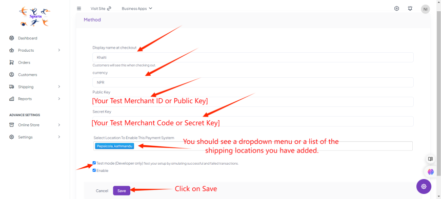 After obtaining ,enter the obtained Merchant ID, Merchant Code, and Secret Key into the respective fields. Ensure the currency is set correctly (NPR for Nepali Rupees). Select the location to enable this payment system, if applicable.