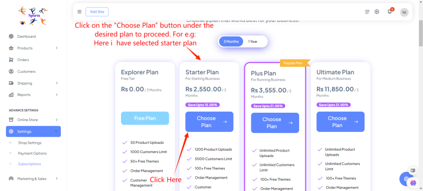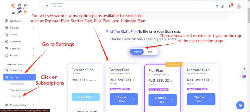 First login to your account. Go to Settings and Click on "Subscriptions".You will see various subscription plans available for selection, such as Explorer Plan, Starter Plan, Plus Plan, and Ultimate Plan. Select the desired billing cycle (3 months or 1 year) by toggling the options at the top of the plan selection page.
