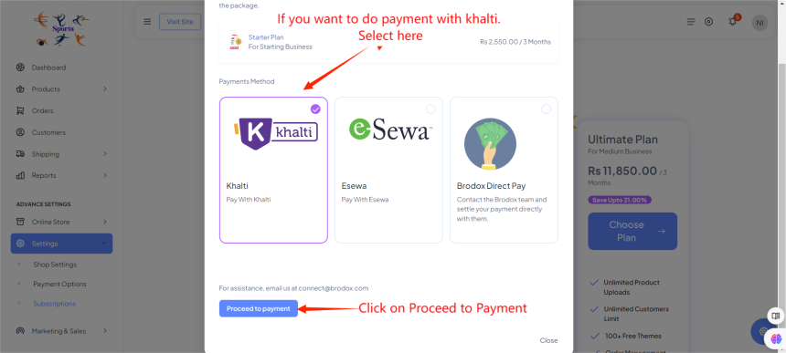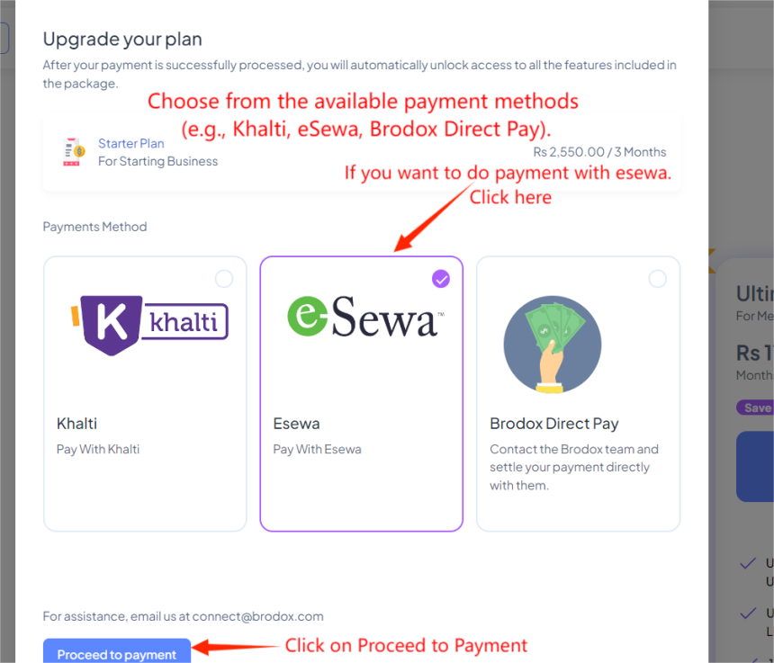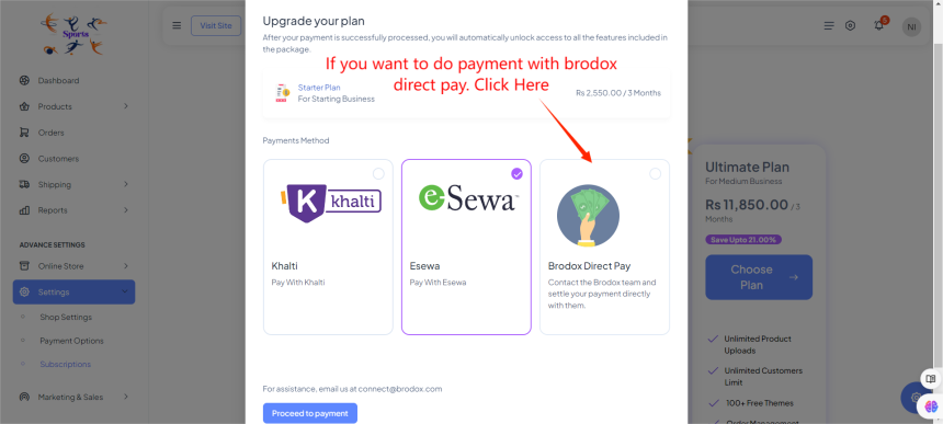 After that, a new screen will show the selected plan details and the cost for the chosen period. Choose from the available payment methods (e.g., Khalti, eSewa, Brodox Direct Pay). If you want to do payment with esewa. Select it and click on to payment proceed.
