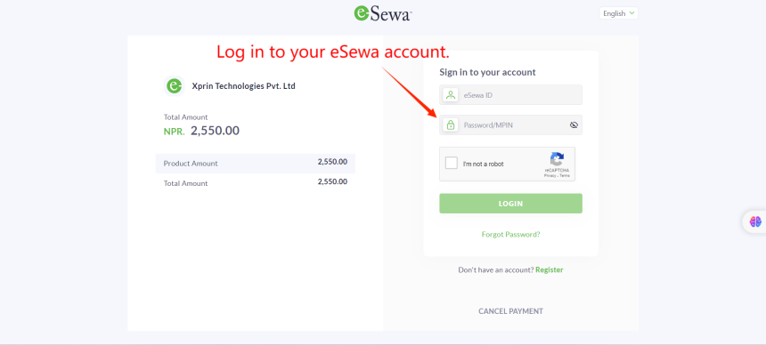 After that, you will be redirected to the eSewa payment gateway. Log in to your eSewa account.