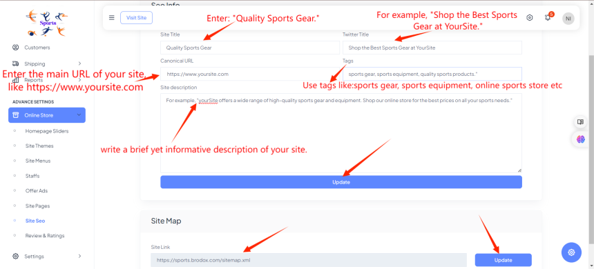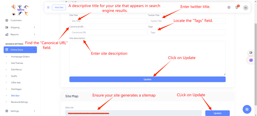 After Clicking on Site Seo, enter the Site Title, Canonical URL, Twitter Title, Tags, and Site Description in their respective fields. After that click on update.