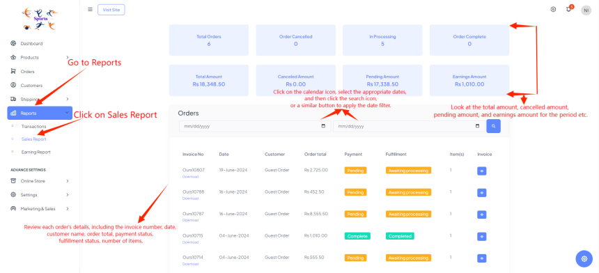 After that, Click on the calendar icon, select the appropriate dates, and then click the search icon or a similar button to apply the date filter. Brodox's financial summary shows total sales, cancelled orders, pending payments, and earnings for the selected period, giving you a clear snapshot of your financial performance.