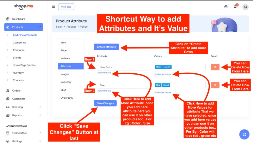 Start by clicking on "Create attributes" to add more rows. Then, in each row, click to add new attributes like color or size, which you can then use across different products. Next, click to add values for each attribute you've selected, such as red or green for color. These values can also be reused for different products. If needed, you can delete any rows you don't need. Finally, remember to save your changes by clicking the save button when you're done.