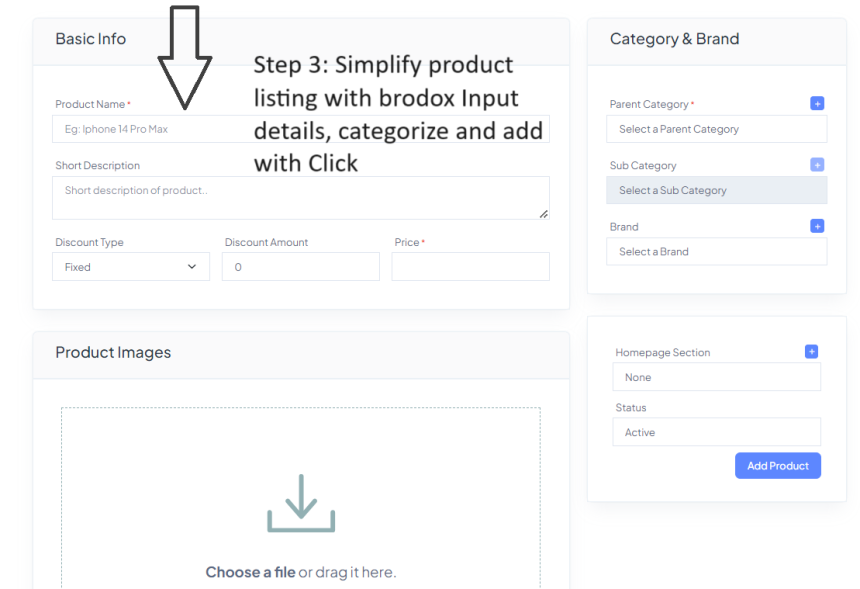 Step 3 : Simplify Product Listing with Brodox: input details, categorize and add with Click
